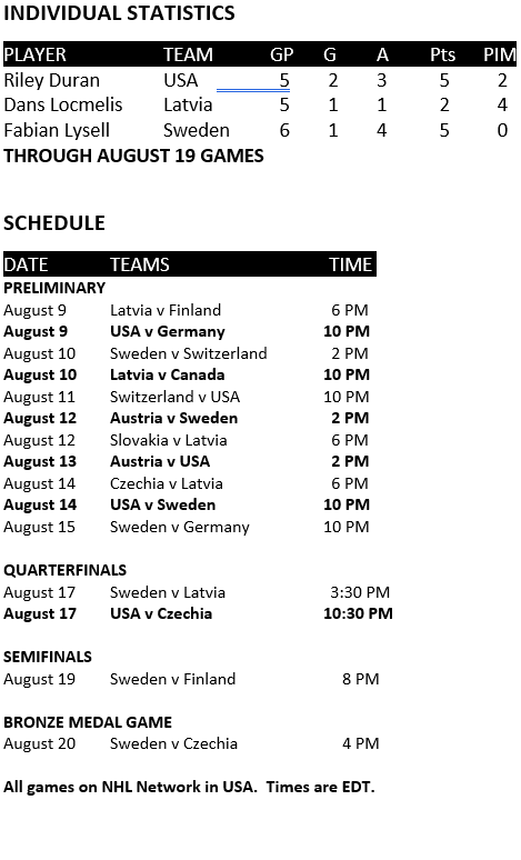 August 12 – SWEDEN 5 v AUSTRIA 0 – Fabian Lysell continues to get better as the tournament progresses. He was a major contributor to Sweden’s win over a lesser Austrian team. Along with his regular second line right wing role he got quality powerplay time, drew two penalties including a penalty shot, was one of four forwards on a late game 4 on 4 and scored his on PP goal.