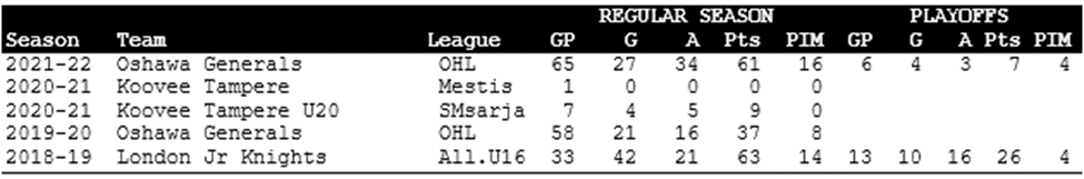 October 14, 2022Returned from injury in OHL home game vs Ottawa 67’s. Played on 3rd line with Jordyn Ertel and Luke Torrance. No points on two SOG and finished game as a +1. Was 1/6 on faceoffs.