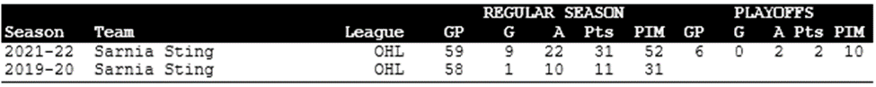 October 1, 2022 – OHL 2-1 overtime road win at Windsor. One of three Sting players wearing alternate captain “A.” Had one assist and one SOG.